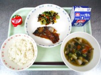 牛乳 ご飯(白米) いなだの梅マヨネーズやき ハム入りお浸し さつま汁 オレンジ...