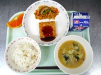 牛乳 麦ごはん ごぼうのつくね 切り干し大根の煮付け じゃがいもの味噌汁 清美オ...