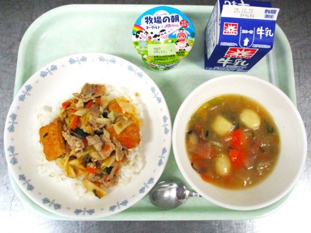 牛乳 麦ごはん 豚キムチ炒め じゃがいも団子汁 ヨーグルト