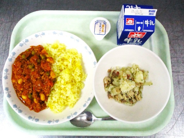 今日は「チリコンカン」です。「チリコンカン」はひき肉や細かくカットした玉ねぎを炒めて、トマト、豆、チリパウダーなどを加えて煮込んだ料理のことです。アメリカの郷土料理として古くから親しまれています。チリコンカンの名前の由来は、スペイン語の唐辛子の『チリ』と牛肉の『カルネ』という意味である「チリ・コン・カルネ」が語源といわれています。残さずしっかり食べて午後のPTAイベントを元気に楽しみましょう。