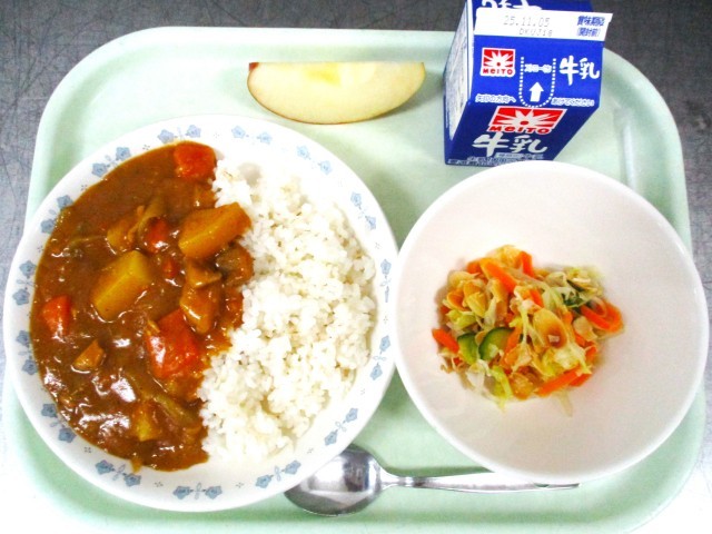 牛乳 チキンカレーライス キャベツとアーモンドのサラダ りんご
