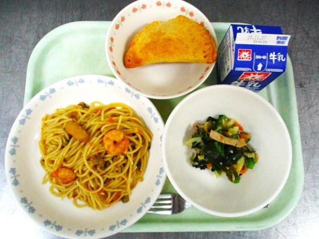 今日は「ハロウィン」です。もともとは、秋の収穫をお祝いしたり、悪いものを追いはらったりする、外国のお祭りです。今では、仮装をしたり、「トリック・オア・トリート!」と言ってお菓子をもらったりする、楽しいイベントになっています。 ハロウィンといえば「かぼちゃ」ですね。今日は、かぼちゃを使った「パンプキンパイ」にしました。 かぼちゃには、体を元気にするビタミンがくさんはいっています。しっかり食べて元気な体をつくりましょう。