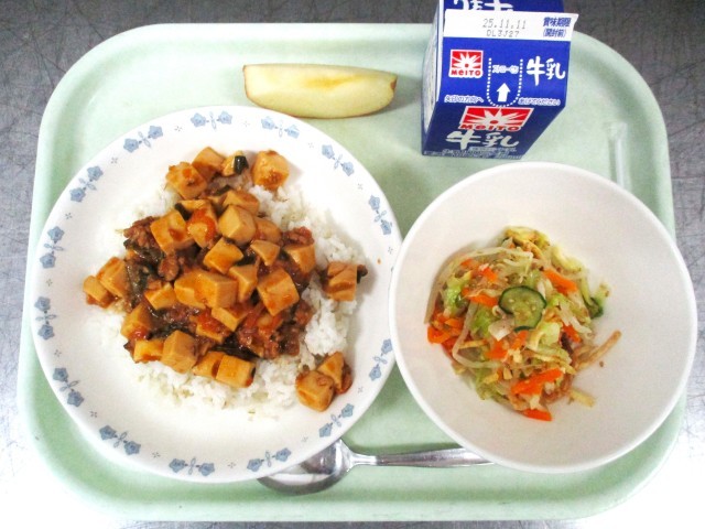 牛乳 麻婆丼 カリカリポテトのハニーサラダ りんご