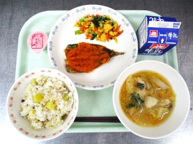 牛乳 さつまいもご飯 いわしの唐揚げ人参ソース 我孫子産野菜の千草和え 白菜の味噌汁 一口いちご牛乳プリン