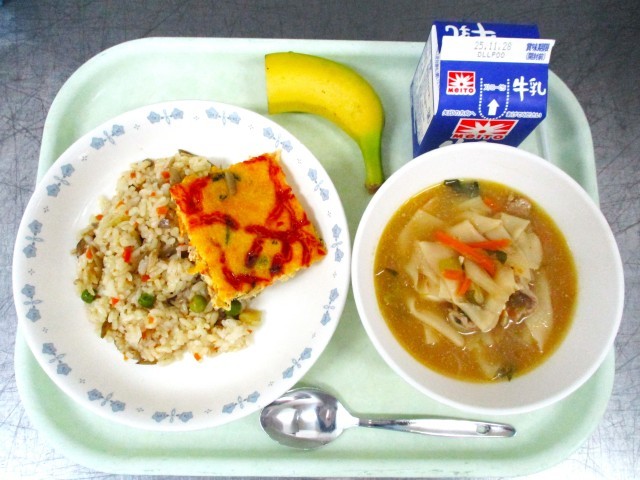 牛乳 鶏ごぼうピラフ ツナオムレツ 味噌ワンタンスープ バナナ