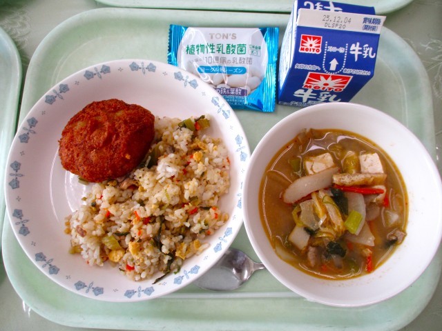 牛乳 野沢菜チャーハン チーズじゃが丸 ごまキムチ汁 ヨーグルトレーズン