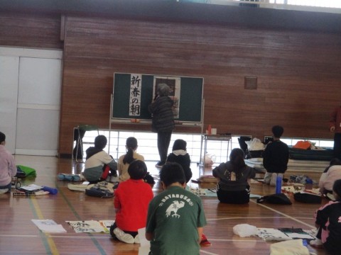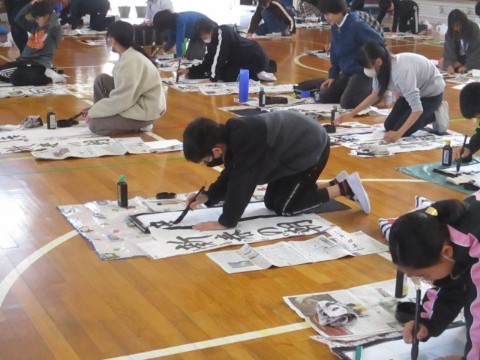 12月2日(火)、6年生と3年生が、体育館にて書き初め学習会を行いました。