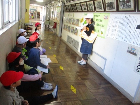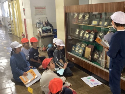 一小の太鼓や校章、鳥窓(教室の入り口のドアの窓が鳥のモチーフになっています!)、フラワーロードや数々のトロフィーなど、3年生が見つけた宝物を、クイズ形式で1年生に教えてくれました。
