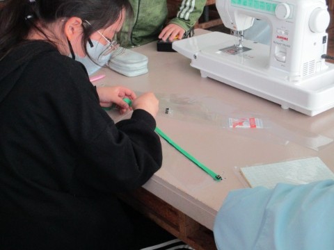 それぞれが役割分担をして、ミシンをかけたり、フエルトシールで文字を切り取ったり。