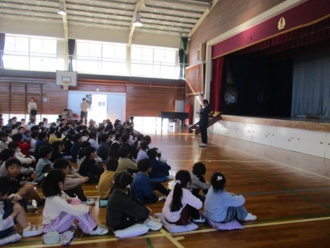 児童は、教室で一次避難をした後、安全確認が取れたとの放送を受け、体育館に集合し、本日の避難訓練について警察の方のお話を聞きました。