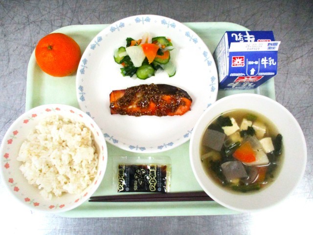牛乳 麦ごはん 鮭の南部焼き おみつけ いも煮汁 ポンカン