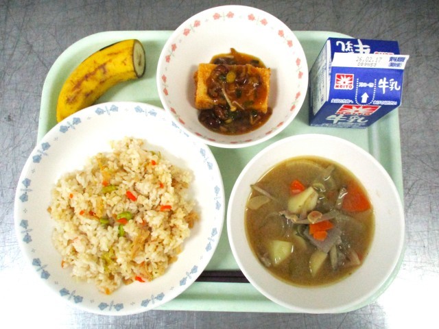 牛乳 するめ入り混ぜご飯 揚げ出汁豆腐のみぞれあんかけ 具だくさん味噌汁 バナナ