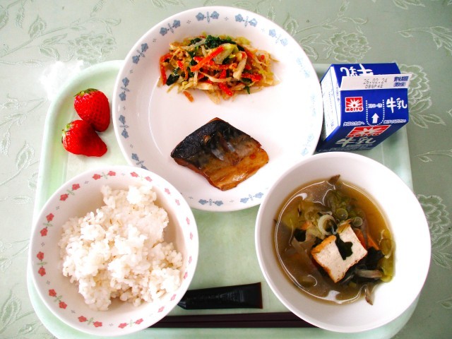 牛乳 麦ごはん 鯖のにんにく煮 野菜のごま和え 田舎汁 いちご(2個) ミルメーク