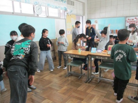 これは、6年生の教室をお祭りの屋台村にかえ、昼休みを利用して1年生から5年生までを順に招待して楽しませるイベントです。
