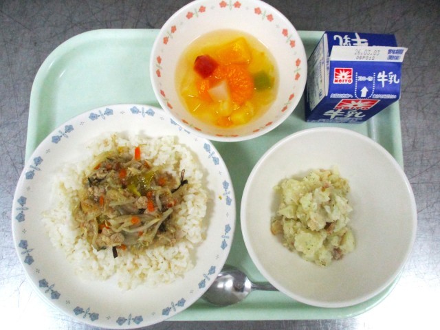 牛乳 ねぎ塩豚丼 ジャーマンポテト カクテルフルーツポンチ