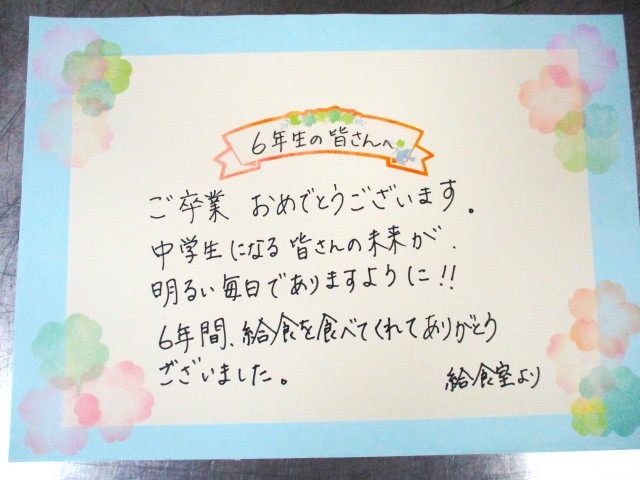今日は、卒業お祝い献立です。写真は調理員さんから6年生に向けてのメッセージカードです。6年生のみなさん、ご卒業おめでとうございます。みなさんの思い出に残る給食は何でしたか?健康で丈夫な体は毎日の食事からできています。中学校でも、今まで学んできたことや給食の献立を思い出して、栄養バランスの良い食事を心がけてください。給食室一同、みなさんのこれからを心より応援しています。