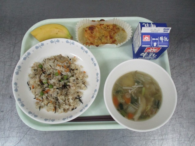 牛乳 ひじきご飯 白身魚のポテト焼き せんべい汁 バナナ