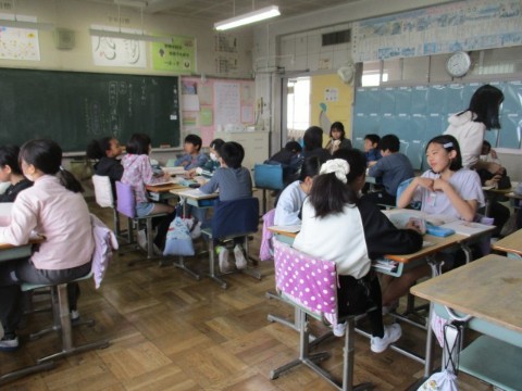 1組は、3組の担任による「心に通じた『どうぞ』のひとこと」(主題 心のぬくもり)、2組は、1組の担任による「心を形に」(主題 礼儀は心の表れ)、3組では、2組の担任による「お母さん、お願いね」(主題 自分の生活を見直す)の学習を行いました。