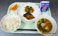 牛乳 ご飯(白米) いなだの梅マヨネーズやき ハム入りお浸し さつま汁 オレンジ...