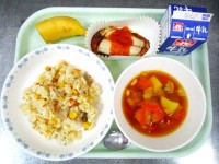 クリスマスの献立 2学期給食最終日牛乳 パエリア チキンカツ アルファベットスー...