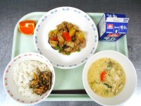 牛乳 麦ごはん ジャーチャン豆腐 五目中華スープ 黒糖大豆 家常豆腐は中国の料理...