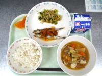 我孫子産野菜の日牛乳 麦ごはん ししゃもの南蛮漬け 小松菜のおかか和え 豚汁 夢...