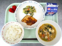 ひなまつりの献立 我孫子産野菜の日牛乳 五目ちらし寿司 鰆の照り焼き お麩と菜の...