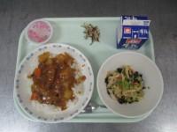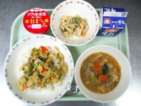 進級お祝い献立牛乳 ポークカレーライス えのきとハムのサラダ 小魚アーモンド お...