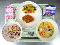 卒業お祝い献立牛乳 栗入りお赤飯 鶏のから揚げ 野菜のごま和え お祝いかきたま汁...