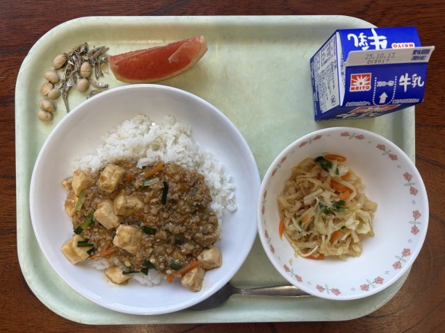 麻婆豆腐丼 切り干し大根のサラダ いりこ大豆 グレープフルーツ