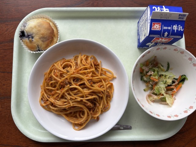 ミートスパゲティ グリーンサラダ 手作り米粉ブルーベリーケーキ