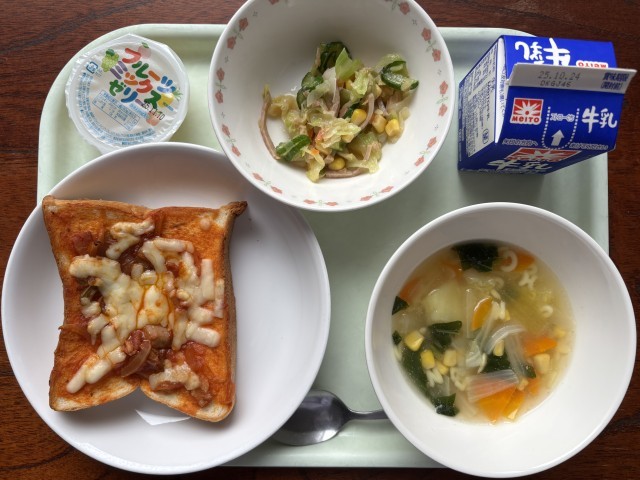 ピザトースト コーンサラダ アルファベットスープ フルーツミックスゼリー