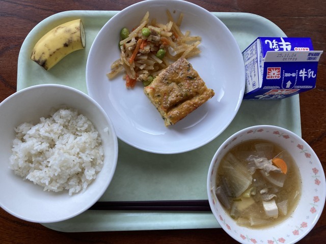 麦ごはん 五目たまご焼き じゃがいものきんぴら 豚汁 バナナ