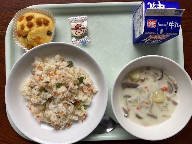 ポークピラフ 秋のクリームスープ ベビーチーズ 手作りかぼちゃ蒸しパン