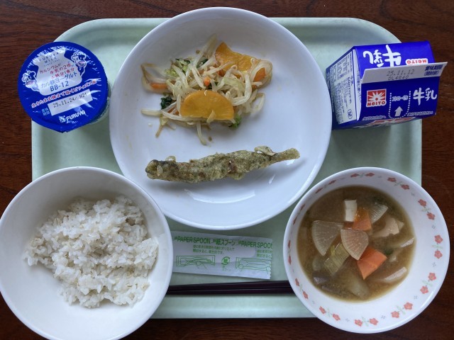 ◎献立麦ごはん ししゃもの磯辺揚げ 根菜汁 たくあん入り和え物 ヨーグルト