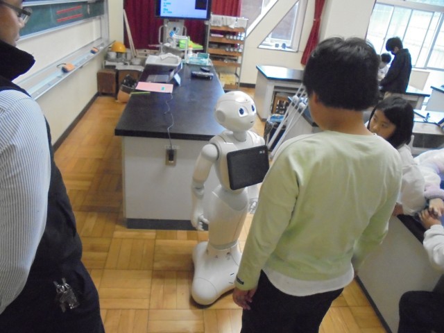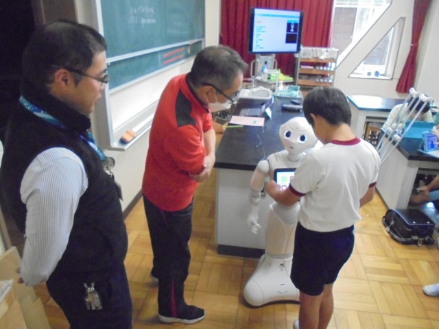 6校時はクラブ活動。今日は現代産業科学館の方が6年生の理科の出前授業をしてくださったのですが(金曜日にもう片方のクラスがその授業を受けるので、内容紹介はその後で)、金曜日の千葉県教育研究会理科教育部会の公開授業のためにロボットのペッパーくんを連れてきてくださったので、プログラミングクラブでは、特別にペッパーくんを動かすプログラミングを体験しました。自分が入力した通りにペッパーくんが反応すると「うわ~!」と感激する子ども達。思いがけないゲストに大喜びでした!