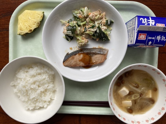 ごはん いなだの照り焼き わかめの和え物 なめこのみそ汁 パイナップル