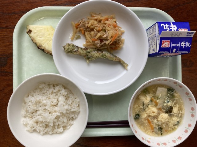 麦ごはん ししゃもの磯辺揚げ じゃがいものきんぴら かきたま汁 パイナップル