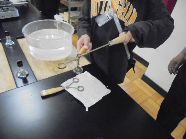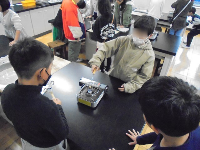 理科室では、4年生が矢作先生と楽しそうに実験していました。「金属の球の温度がかわると体積はどうなるか?」の実験です。熱する前は金属のリングを通り抜ける金属の球。ではガスコンロの火で球を熱したらリングを通り抜けるか調べます。熱した球をリングに通そうとすると…通り抜けない!その球を水で冷やすと…通り抜ける!「おお!」「本当だ!」温度によって金属の体積がかわることがわかりました。