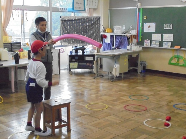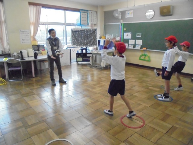 ゆりのき体育の時間では、佐野先生と一緒に様々な活動をしていました。まずはボールを片手で投げたり両手で投げたりバウンドさせたりして先生とキャッチボールです。「足を一歩前に出して投げる」と言いながら体の使い方を確認して投げていました。狙ったところに玉を投げる練習では、どの色の輪に入れるか自分で宣言してから玉を投げます。どれくらいの力加減で投げたらよいのか、どの方向に投げたらよいのか考えて投げる子ども達。見事に玉が狙った輪に入ると、周りから拍手が。「やったね!」先生にもほめられて嬉しそうな笑顔が印象的でした。