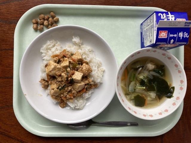 麻婆豆腐丼 わかめスープ 黒糖大豆