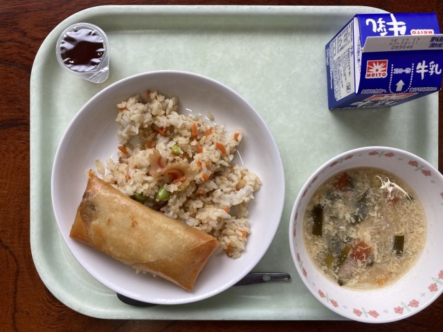 焼き肉チャーハン あじのチーズ春巻き サンラータン 一口ぶどうゼリー