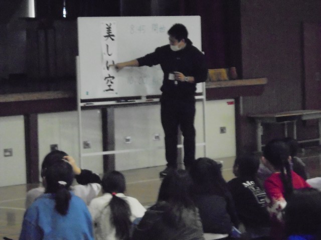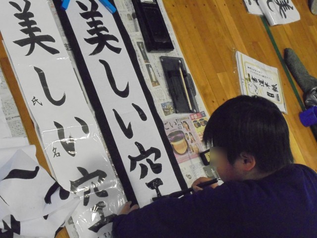 まずは5年生。お題は「美しい空」です。書き始める前に、「美」や「空」は画の長さや間隔に気を付けること、ひらがなは運筆を意識すること、漢字とひらがなの大きさのバランスなど先生からアドバイスがあり、子ども達はしっかりと聞いていました。難しいお題ですが、書き始めると黙々と練習に励んでいました。