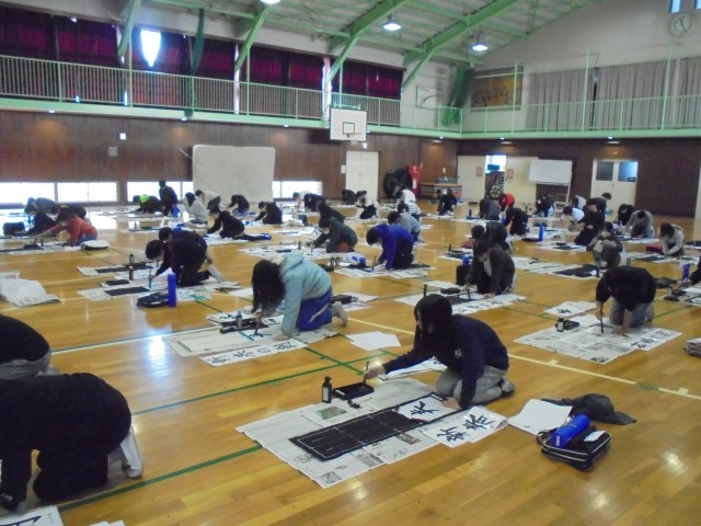 そして6年生。お題は「新春の朝」です。難しい漢字が3つもあり、一文字ずつポイントを押さえながら練習です。様子を見にいらした市教委の先生も「落ち着いて話を良く聞いていますね。」とおっしゃってくださった通り、先生のアドバイスを真剣に聞いては手本を見ながらしっかり練習しました。