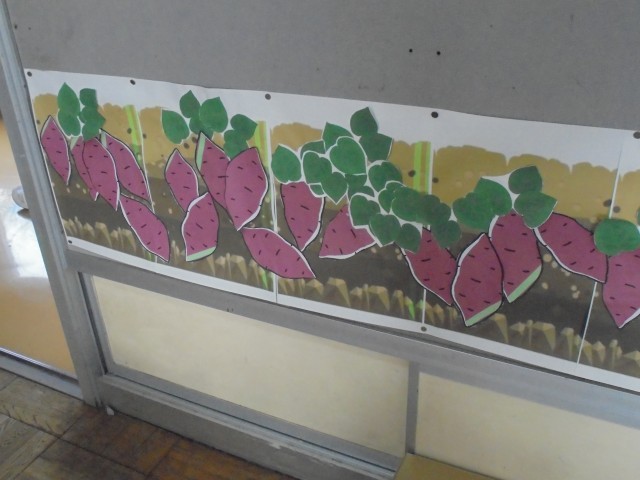 3学期には、畑で収穫したサツマイモでおいもパーティーを計画中だとか…。頑張って学習したら壁にサツマイモを貼って、3学期のおいもパーディーを楽しみにしているみんなでした。