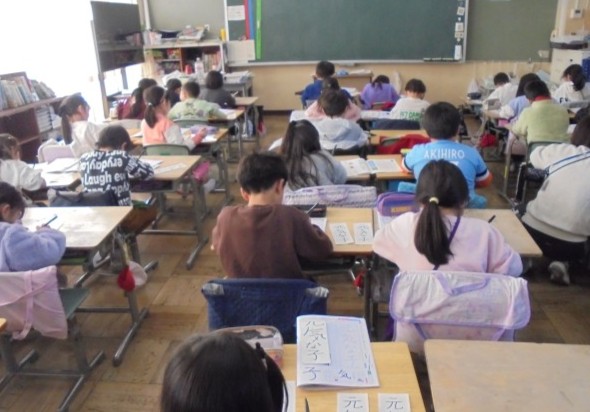 2年生は教室で「元気な子」とフェルトペンで書きました。練習して自分で添削したり、友達と見せ合ってアドバイスしたりしてから、本番の紙に書きました。枠の中に大きく丁寧に書くことができました。