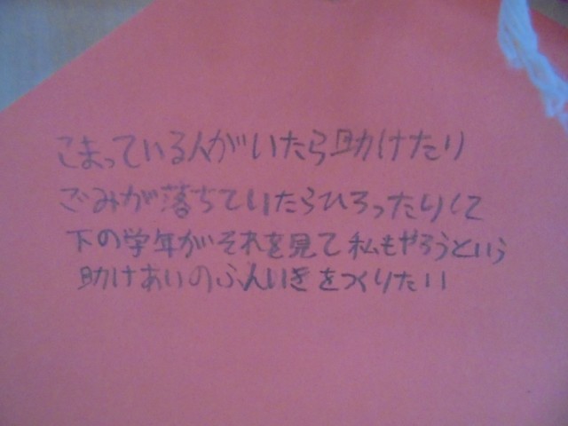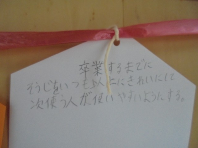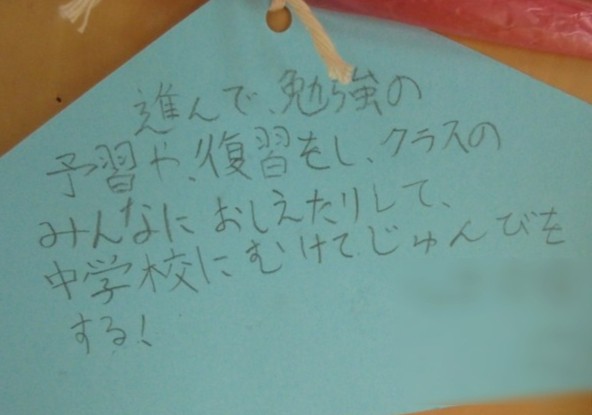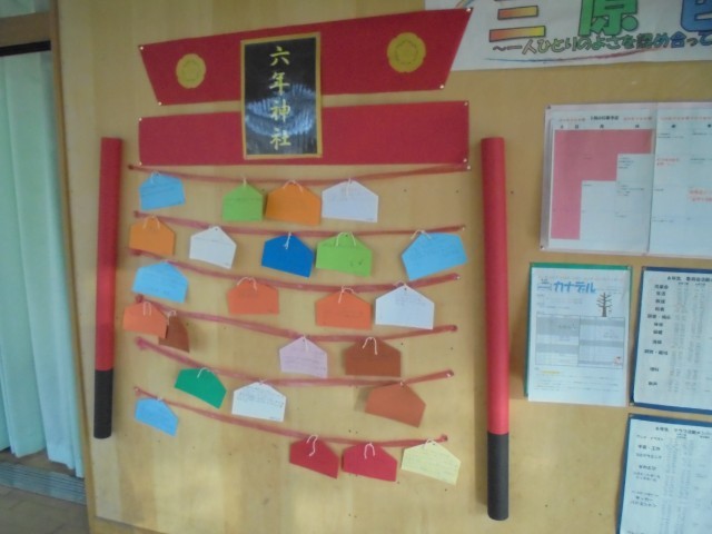 そんな6年生教室の廊下には「6年神社」が!絵馬の形の札には、それぞれ3学期どう過ごしたいのか、6年生の思いが書かれていました。6年生らしい立派な思いが表れていて、頼もしく感じました。