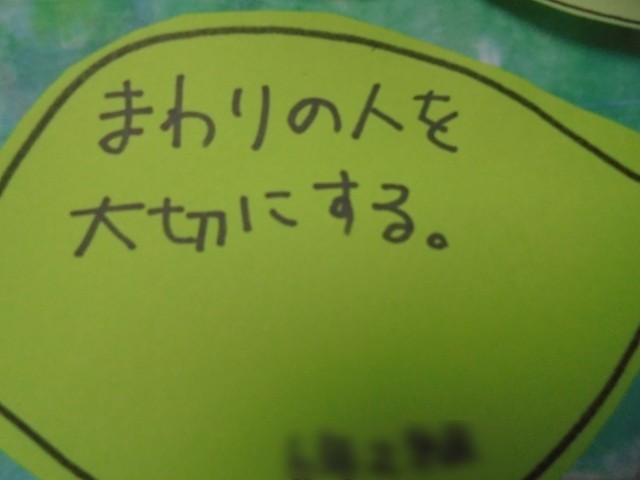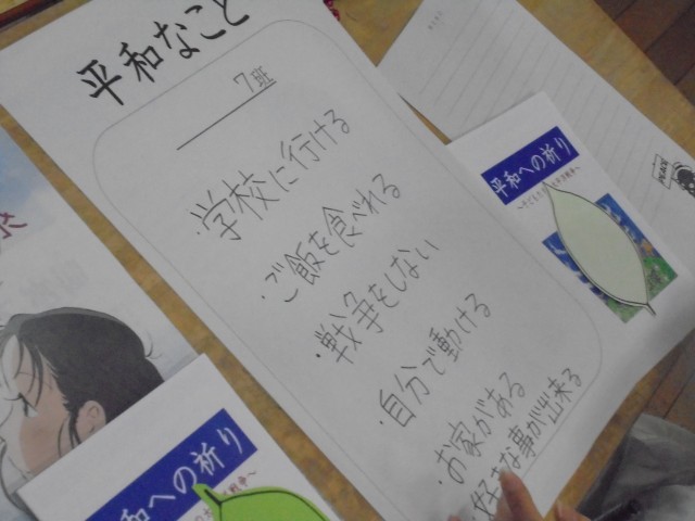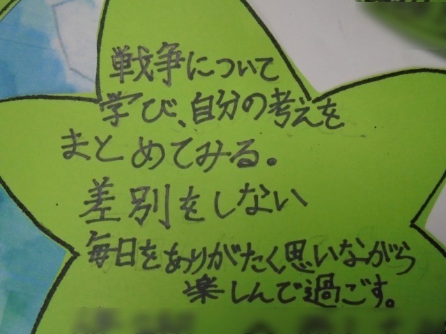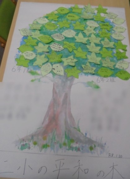 1組も2組も、講師の皆さんの話を真剣に聞き、原爆の恐ろしさ、戦争の悲惨さを改めて感じました。そして、平和なこととはどんなことなのか話し合いました。「安心して寝られること」「学校に来られること」「食べられること」「家族と暮らせること」…いろいろな意見がたくさん出ました。最後に平和な世の中にするためにできることを考えて葉っぱに書きました。「人にやさしくして争いをしない」「戦争について学ぶ」「命を大切にする」…全員の思いが集まって一つの平和の木になりました。