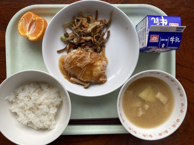 麦ごはん 和風ハンバーグ 五目きんぴら 5年2組代表みそ汁 ぽんかん