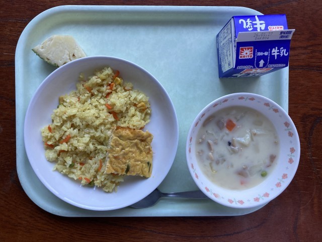 カレーピラフ ねぎのキッシュ風たまご焼き あさりのチャウダー パイナップル